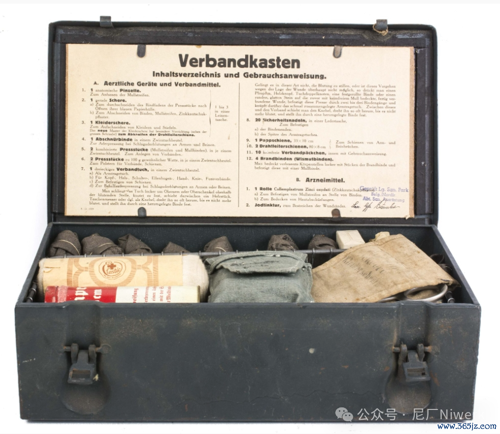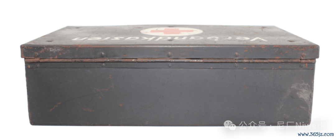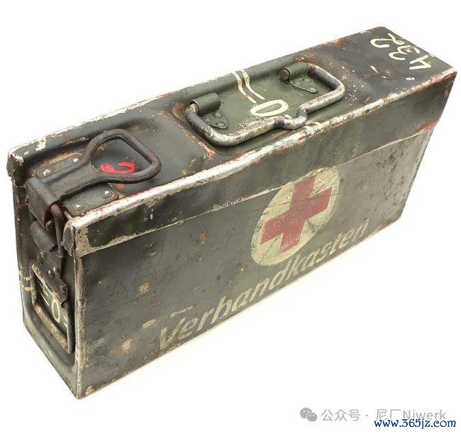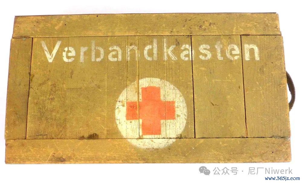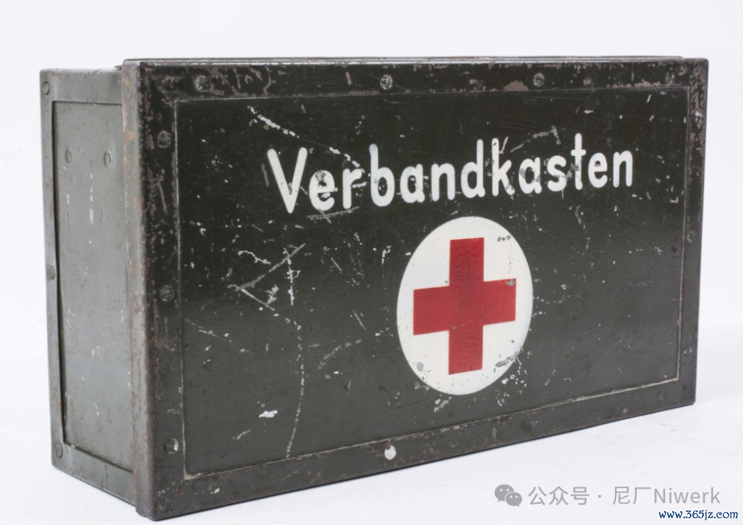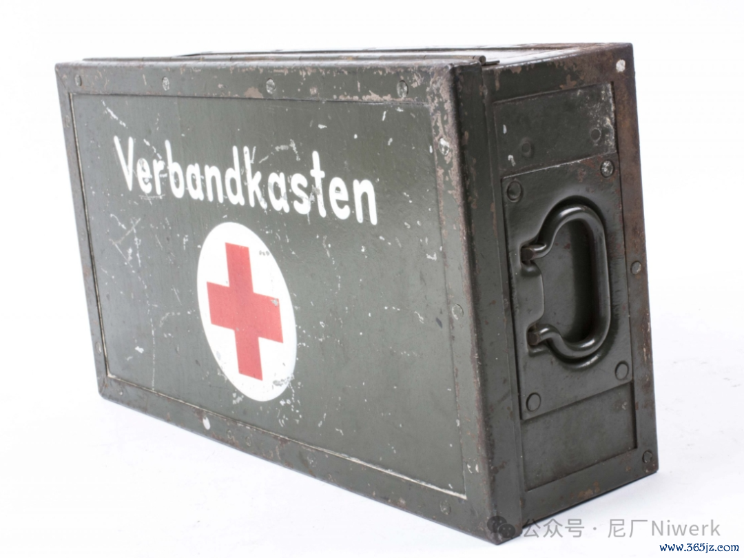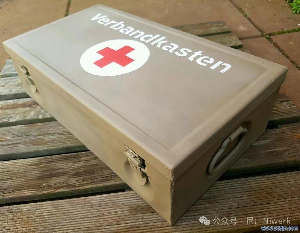 车载急救箱箱体不错是荒原灰色、德国灰色或黄色。盖子名义带有红十字记号和“Verbandkasten”字样,很容易和其他的随车器具箱差别开来。箱内装有包扎敷料、药物和一些基础的医疗器械,用来对战场常见的枪伤、炸伤、擦伤、烧烫伤、骨折、失血等情况进行省略处分。