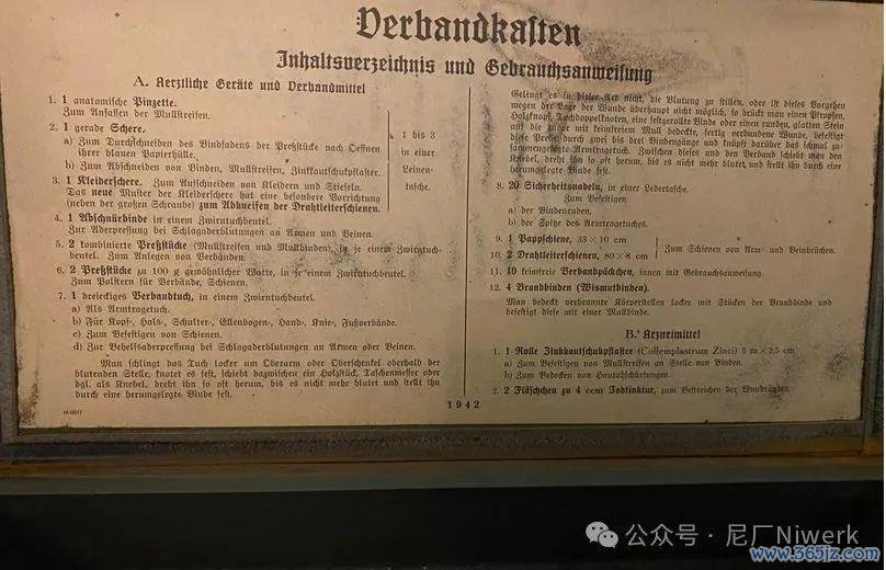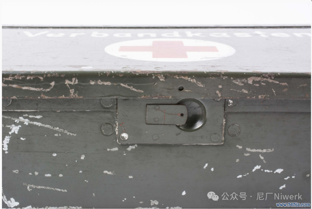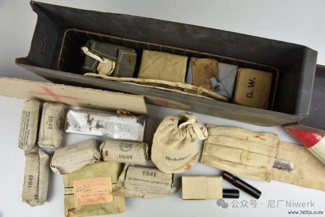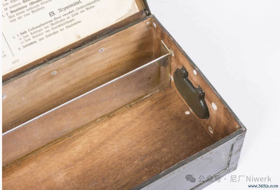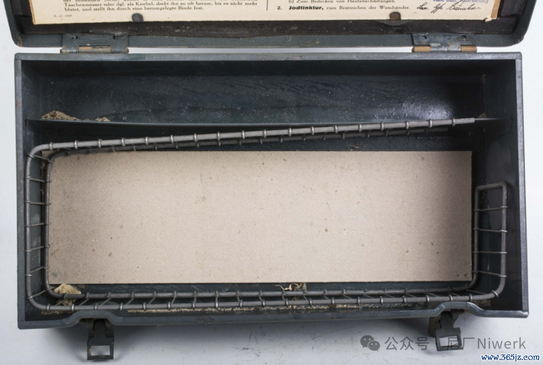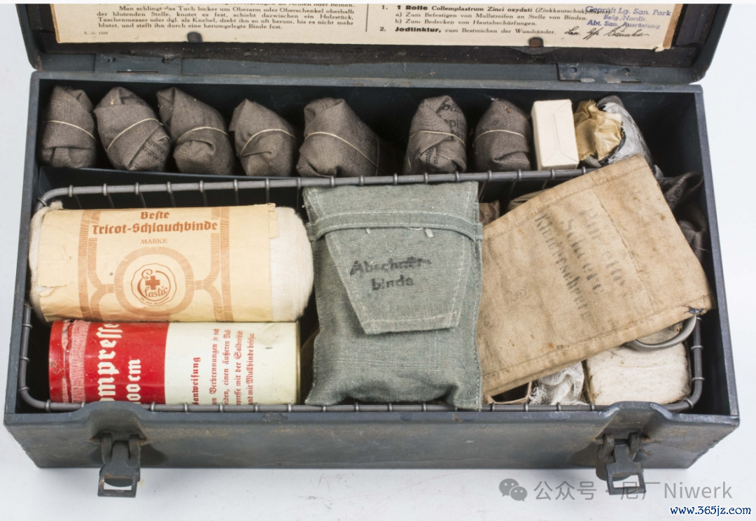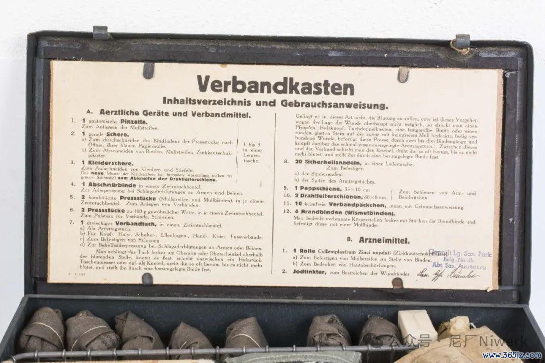 车载急救箱箱体不错是荒原灰色、德国灰色或黄色。盖子名义带有红十字记号和“Verbandkasten”字样,很容易和其他的随车器具箱差别开来。箱内装有包扎敷料、药物和一些基础的医疗器械,用来对战场常见的枪伤、炸伤、擦伤、烧烫伤、骨折、失血等情况进行省略处分。