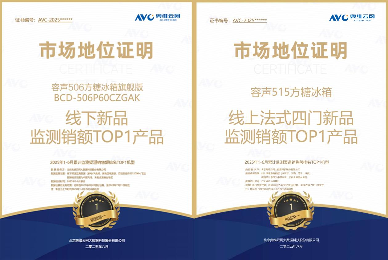 奥维云网(AVC)2025年1-6月累计监测渠谈销售额名次披露开云kaiyun,容声506方糖雪柜旗舰版斩获线下新品销售额榜首,容声515方糖雪柜则登顶线上尺度四门新品销售额第一。